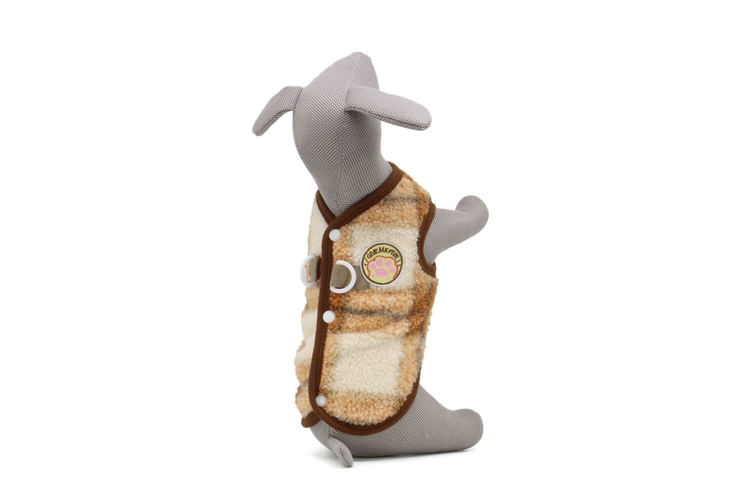 Na zádech najdete dvojité plastové kroužky – kdykoliv tak můžete připnout vodítko a vyrazit ven bez obojku.