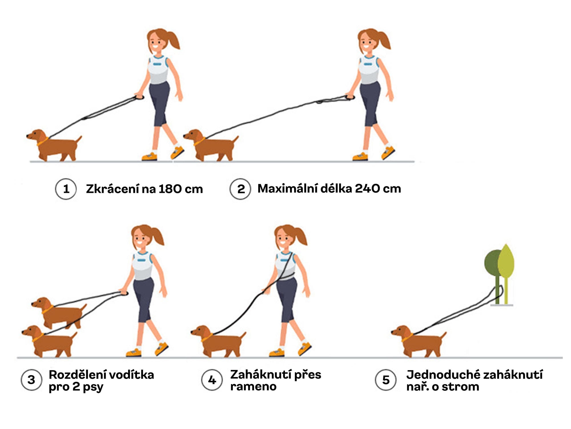 Délku vodítka lze regulovat několika způsoby. Můžete zanechat maximální možnou délku 240 cm, nebo ji zkrátit na cca 180 cm. Také máte možnost vodítko zaháknout přes rameno nebo velmi jednoduchým způsobem například o strom či sloup. Je možné vodítko rozdělit a použít na dva psy současně. Lepší představu o možnostech použití vodítka získáte nahlédnutím do fotogalerie tohoto produktu.