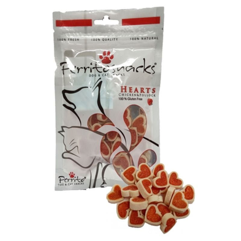 Zdravé, české pamlsky Perrito srdíčka z kuřecího masa s rybou, obsahují málo tuku a hodně bílkovin. Sušené horkým vzduchem. 100% přírodní. Uskladnit v chladu na suchém místě. Po otevření uchovávat v lednici a spotřebujte do 7 dnů. Nekonzumujte absorbér kyslíku. Minimální trvanlivost: viz datum na obalu. Není určeno pro lidskou spotřebu. Doplňkové krmivo pro psy a kočky.