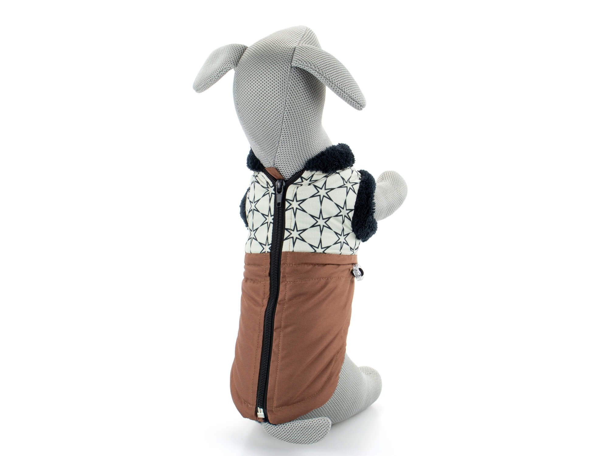 Stylová psí bunda rozměrově vhodná pro malá a střední plemena s délkou zad 22 – 43 cm. Zateplenou zimní bundu pro psy upotřebí krátkosrstí i dlouhosrstí chlupáči. Kvalitní a voděodolný polyesterový materiál ochrání kožíšek před znečištěním a díky podšitému fleecu poskytne hřejivou vrstvu. Disponuje praktickým zapnutím pomocí zipu, tím Vám ulehčí a zrychlí oblékání. Bundička dominuje nejen svojí nepromokavou a zateplenou funkcí, ale také možností upravit střih dle potřeby. Gumičky nacházející se po obvodu pasu a spodní části  bundy umožní obleček stáhnout a tím zaručit obepnutí a okopírování těla pejska bez odstávání. Pro psí kluky je bunda opatřena mechanismem, který dokáže spodní část utáhnout až na břicho a zabránit tak případné nehodě během vyprazdňování. Tuto funkci zajistíte provléknutím gumičky do pouta na spodní straně bundy. Zimní obleček potěší také svojí snadnou údržbou
