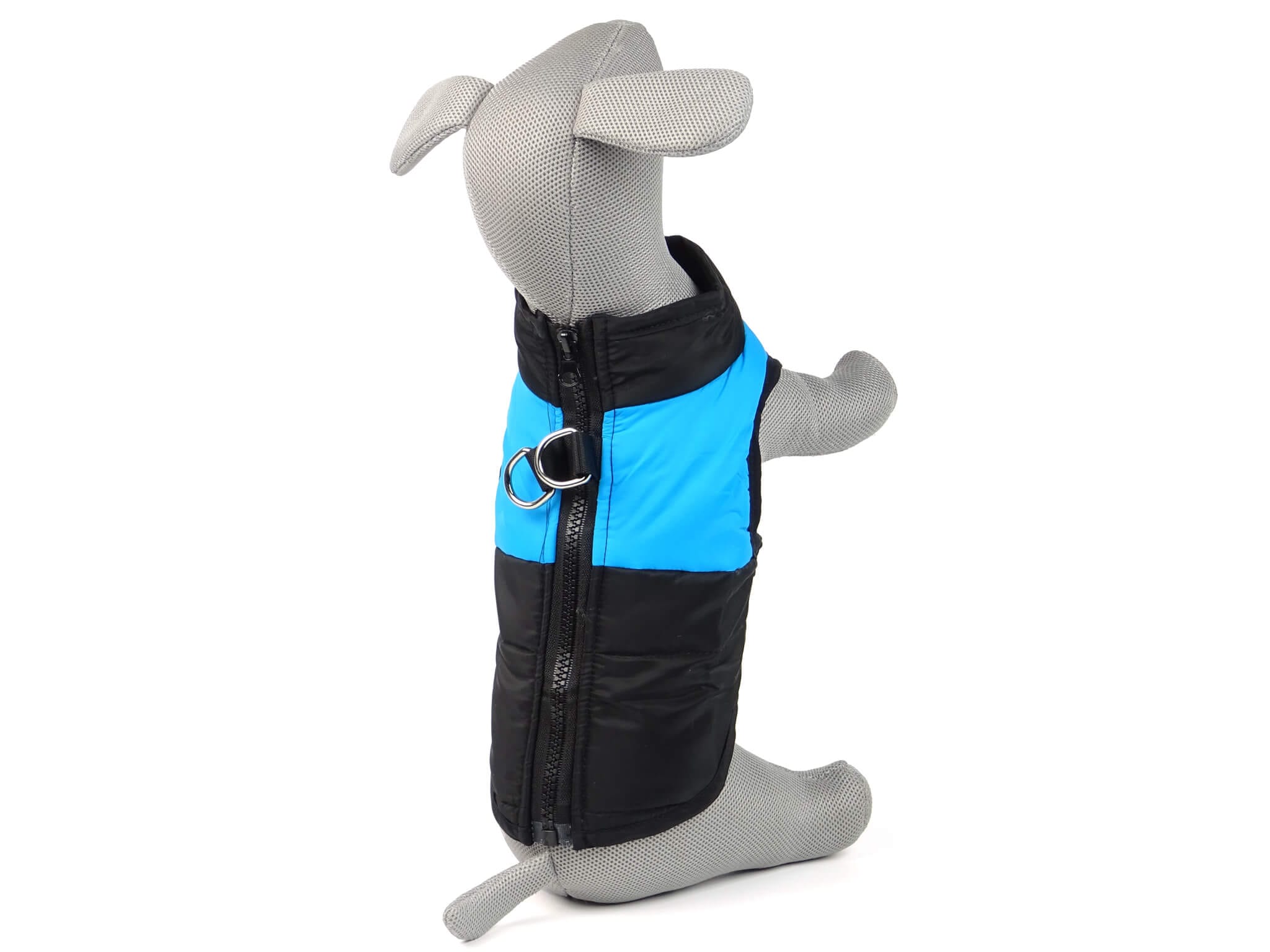 Obleček pro psy je ušitý z nepromokavého polyesteru a zateplený vnitřní vatovou výplní.