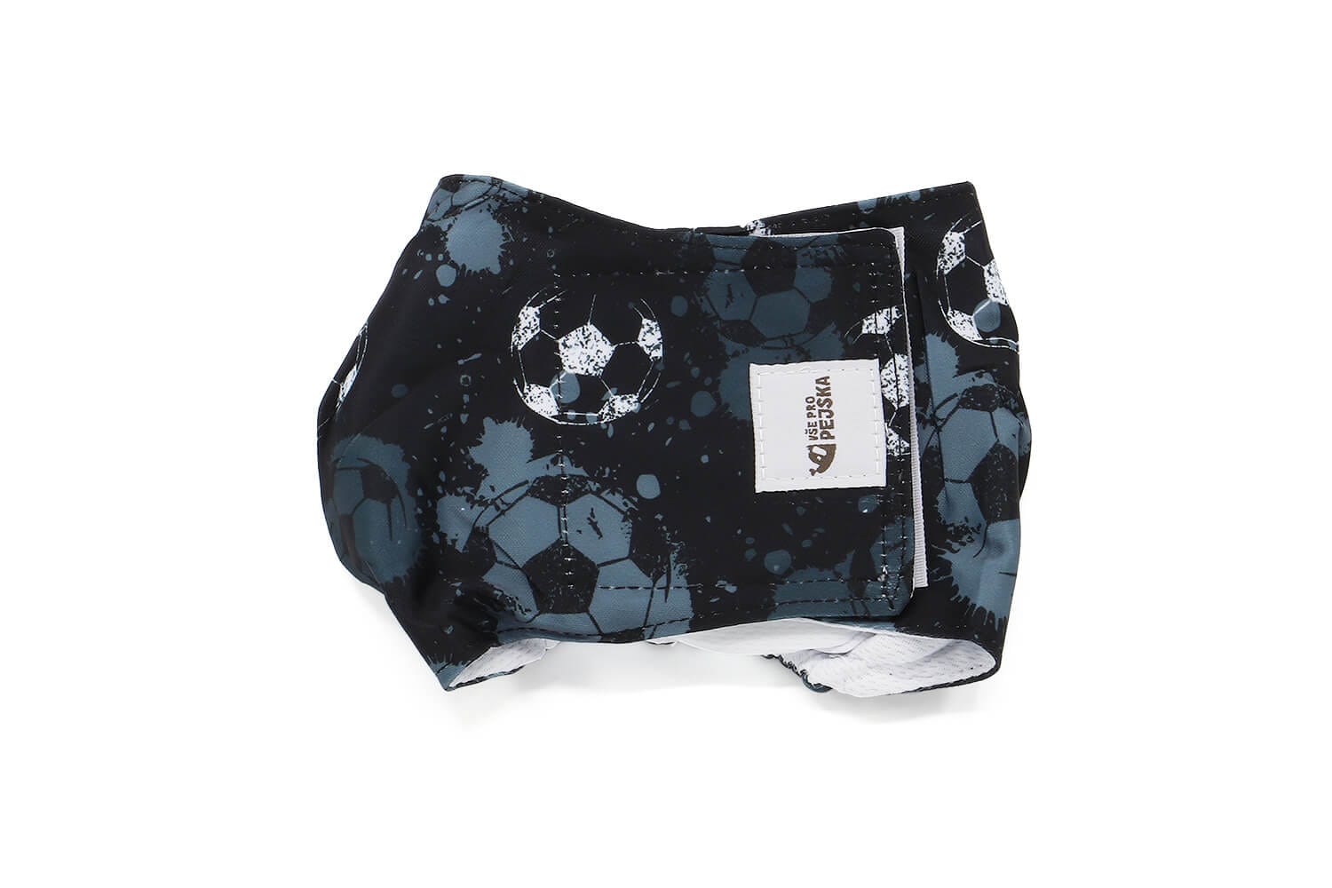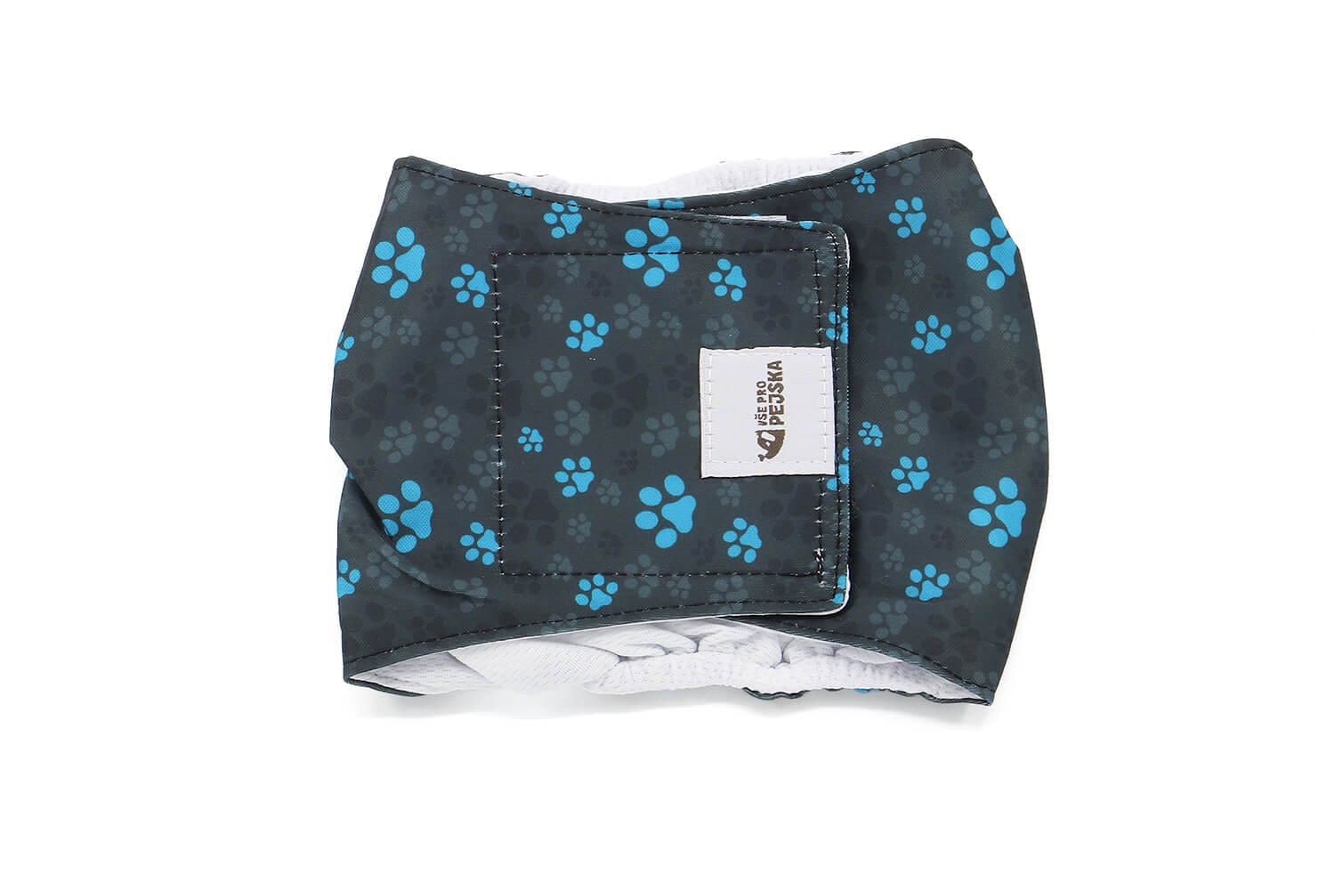 - Aplikace pásu: Nasaďte pás kolem slabin vašeho psa tak, aby pokryl jeho genitálie, a zajistěte ho pomocí suchých zipů na pásu.