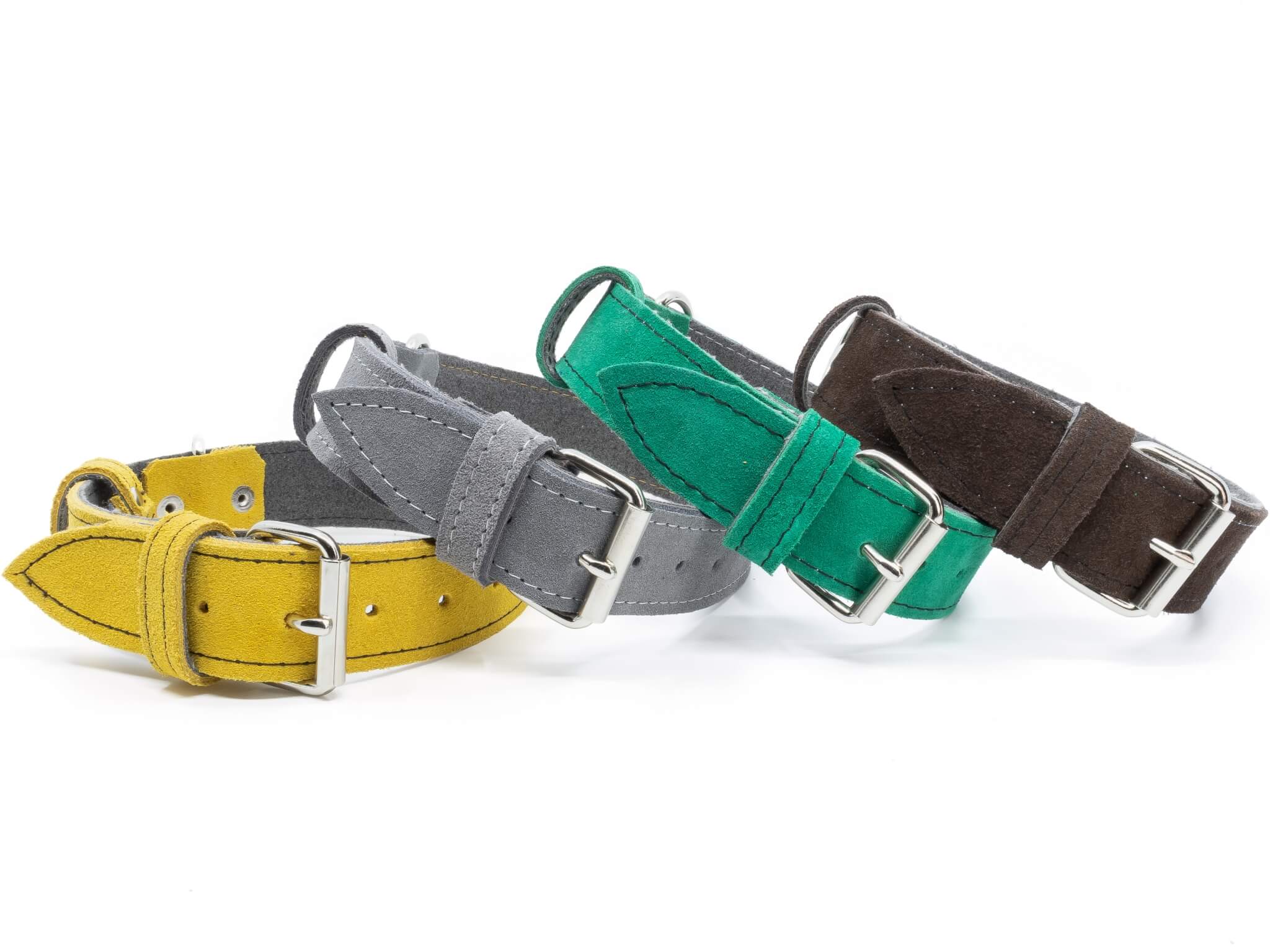 Velur kožený obojek vhodný pro malá a středně velká psí plemena s obvodem krku v rozmezí 13 – 48 cm. Vyrobený z materiálu tzv. veluru. Jde o kůži broušenou po rubu, vlas zůstavá na povrchu. Po opracování vznikne typ semiše, který je na dotek velmi jemný. Dominanta obojku spočívá v menší náchylnosti k poškození. Zapínání je řešeno pomocí kovové přezky. Je možné měnit délku obojku dle potřeby. Před prvním použitím doporučujeme ošetřit obojek ochranným sprejem vhodným přímo k ošetření semiše. V případě znečištění vyčistěte kártáčkem nebo houbičkou s hrubší strukturou a čistící pěnou speciálně vyrobenou k čištění semiše.