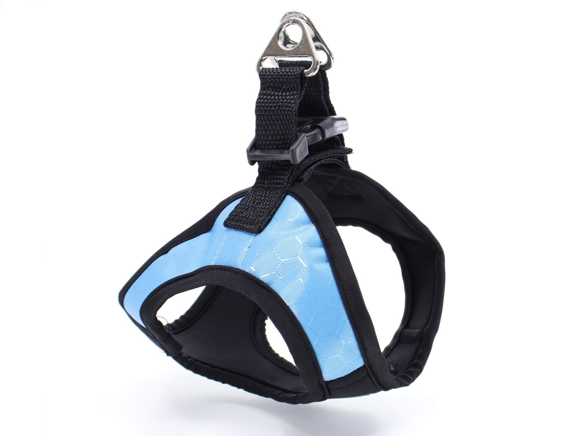 Psí postroj je vyrobený z polyesteru, nylonu, plastu a kovu.